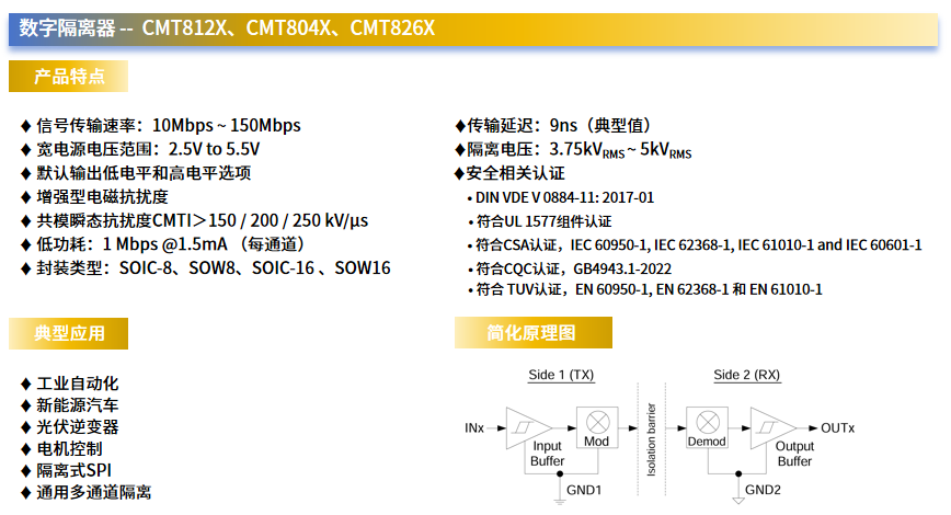 CMT812X(2通道)、CMT804X(4通道)与CMT826X(6通道)系列标准容耦隔离器采用的是稳健可靠的二氧化硅(SiO2)绝缘栅,不仅支持高达5 kVRms隔离电压、8kV浪涌能力以及40年以上的预期使用寿命,还可显著增强器件电磁兼容性(EMC),有效满足系统级ESD、EFT、浪涌和辐射方面的合规要求。