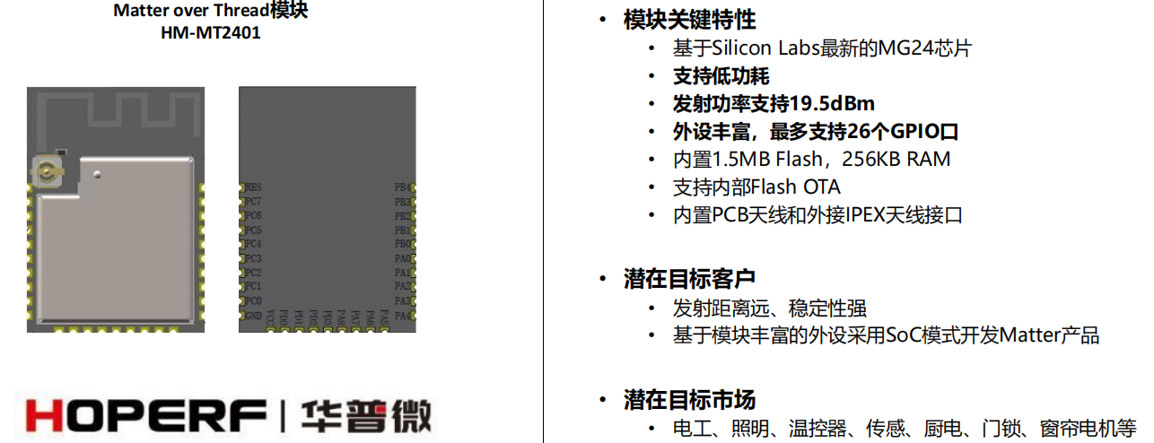 例如,玖鼎微自主研发的HM-MT2401就是一款基于2.4GHz频段的Matter over Thread无线通信模块,其已被广泛应用于LED灯具、智能开关、智能插座、智能门锁、智能窗帘电机、智能门铃、智能温控器及智能传感器等众多智能家居设备之中。