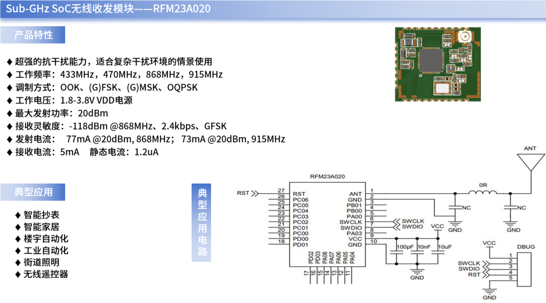 玖鼎微作为国内Sub-GHz无线射频自研芯片领域的先行者,已在无线通信领域耕耘二十余载,其自主研发的RFM23A020就是一款具备轻量化组网特性、易于部署与易于维护的SoC射频收发模块,可有效填补市场中低功耗、轻量化组网方案的空白。