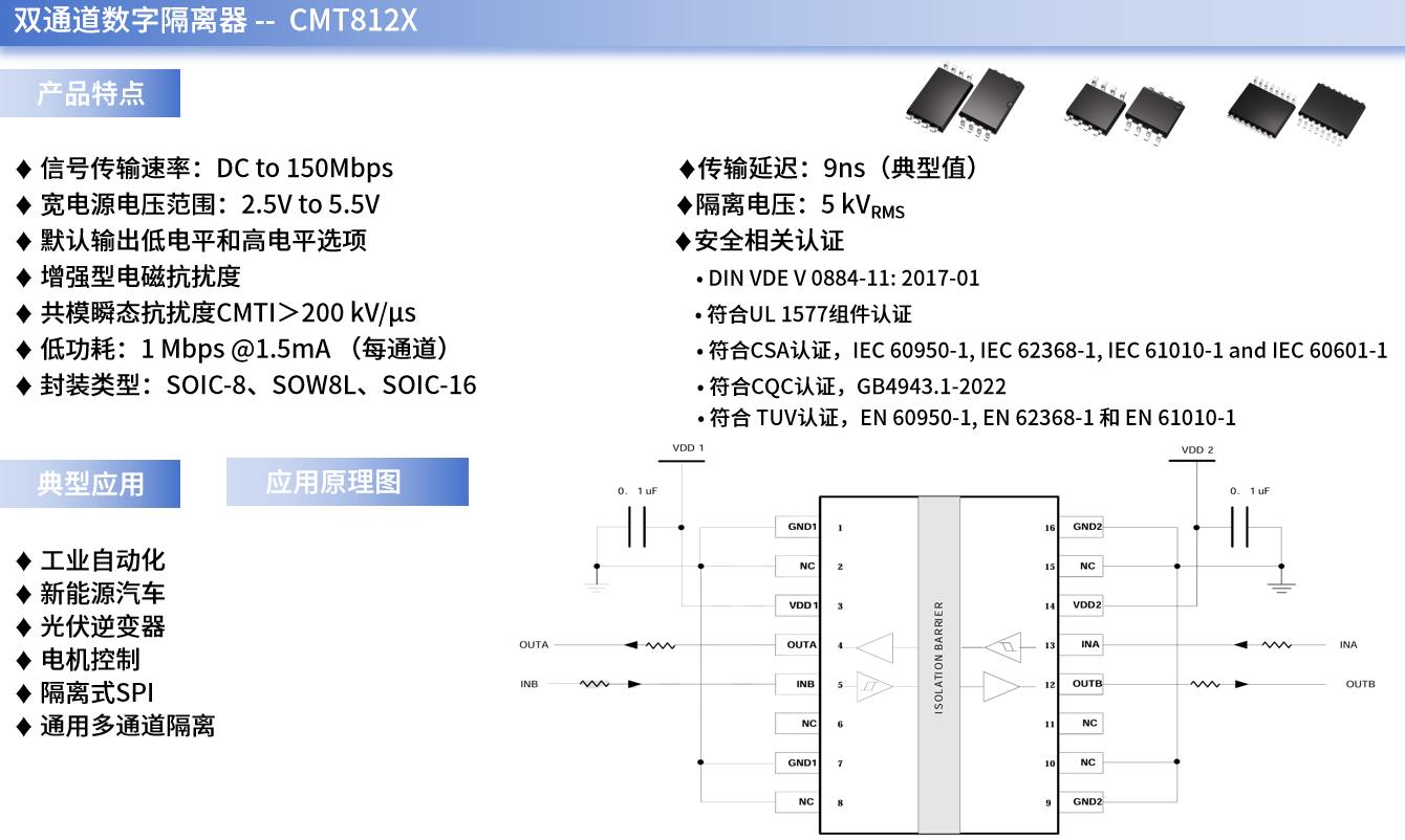 例如,CMT812X就是一系列玖鼎微自主研发的、可用于USART串口通信中的高速双通道数字隔离器。它采用二氧化硅(SiO2) 绝缘栅,支持高达5 kVrms隔离电压,应用在两个不同电源域间通讯时,还能防止数据总线或其他电路上的噪声电流进入本地接地或者干扰及损坏敏感电路。