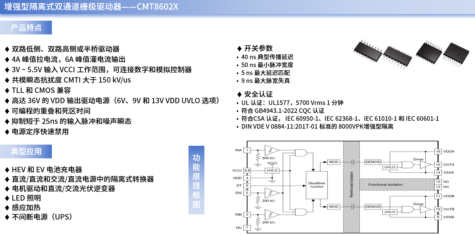 现阶段,隔离式栅极驱动器已被广泛应用在电机驱动系统、光伏逆变系统与大功率电源等应用场景中;例如,玖鼎微所自主研发的CMT8602X就是一系列增强型的隔离式双通道栅极驱动器,其4A的峰值拉电流和6A的峰值灌电流不仅可驱动高达5MHz的功率晶体管,还具有一流的传播延迟和脉宽失真度。