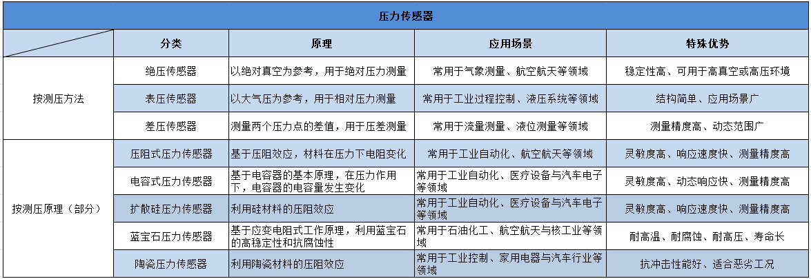 压力传感器是指能感受压力信号,并能按照一定的规律将压力信号转换成可用的电信号的器件或装置。压力传感器通常由压力敏感元件和信号处理单元组成,按不同测压方法,压力传感器可分为表压传感器、差压传感器和绝压传感器;按不同测压原理,压力传感器又可分为常见的压阻式压力传感器、电容式压力传感器、扩散硅压力传感器、蓝宝石压力传感器与陶瓷压力传感器等。