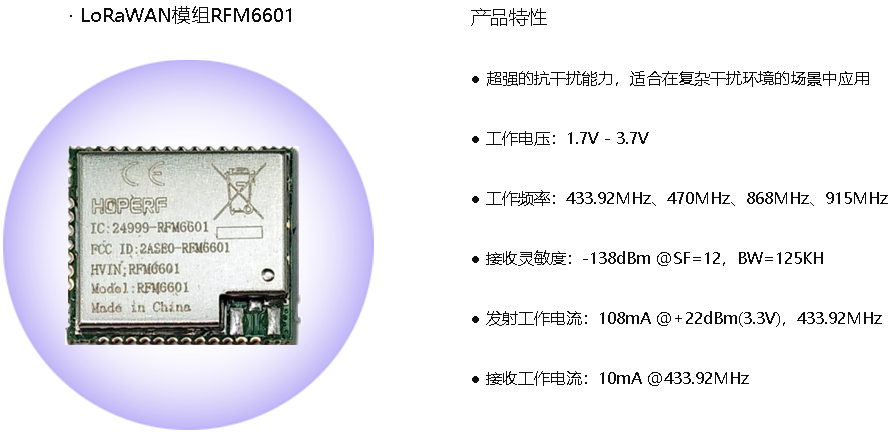 例如,RFM6601就是一款用于构建LoRa网络的低功耗LoRa模块,其采用了先进的数模混合设计,基于独创自适应速率算法,可高效连接物联网并延长LoRaWAN设备的使用寿命,并已通过FCC认证。