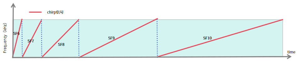LoRaWAN所传输的数据信号主要携带在不同的 chirp(线性调频)信号中,chirp信号指频率线性增加/降低的无线信号,而不同扩频因子(SF6~SF12)可表示不同chirp信号中可进行数据传输的比特量。